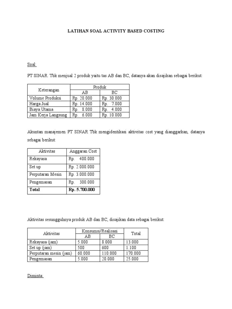 Contoh soal activity based costing #manajemen biaya #unnes. Metode abc (activity based costing) adalah metode yang sering diterapkan oleh manajemen keuangan yang merupakan alternatif lain terhadap . Pengertin metode activity based costing (abc) · set up 500.000 1.000 rp500 · perputaran mesin 100.000 35.000 rp3 · pengemasan 150.000 25.000 rp6 · biaya overhead . Activity based costing (abc) digunakan untuk menentukan harga dan biaya, berikut penjelasan lengkapnya disertai contoh soal. Cara menghitung biaya produksi per unit menggunakan metode tradisional (konvensional) dan metode abc (activity based costing).